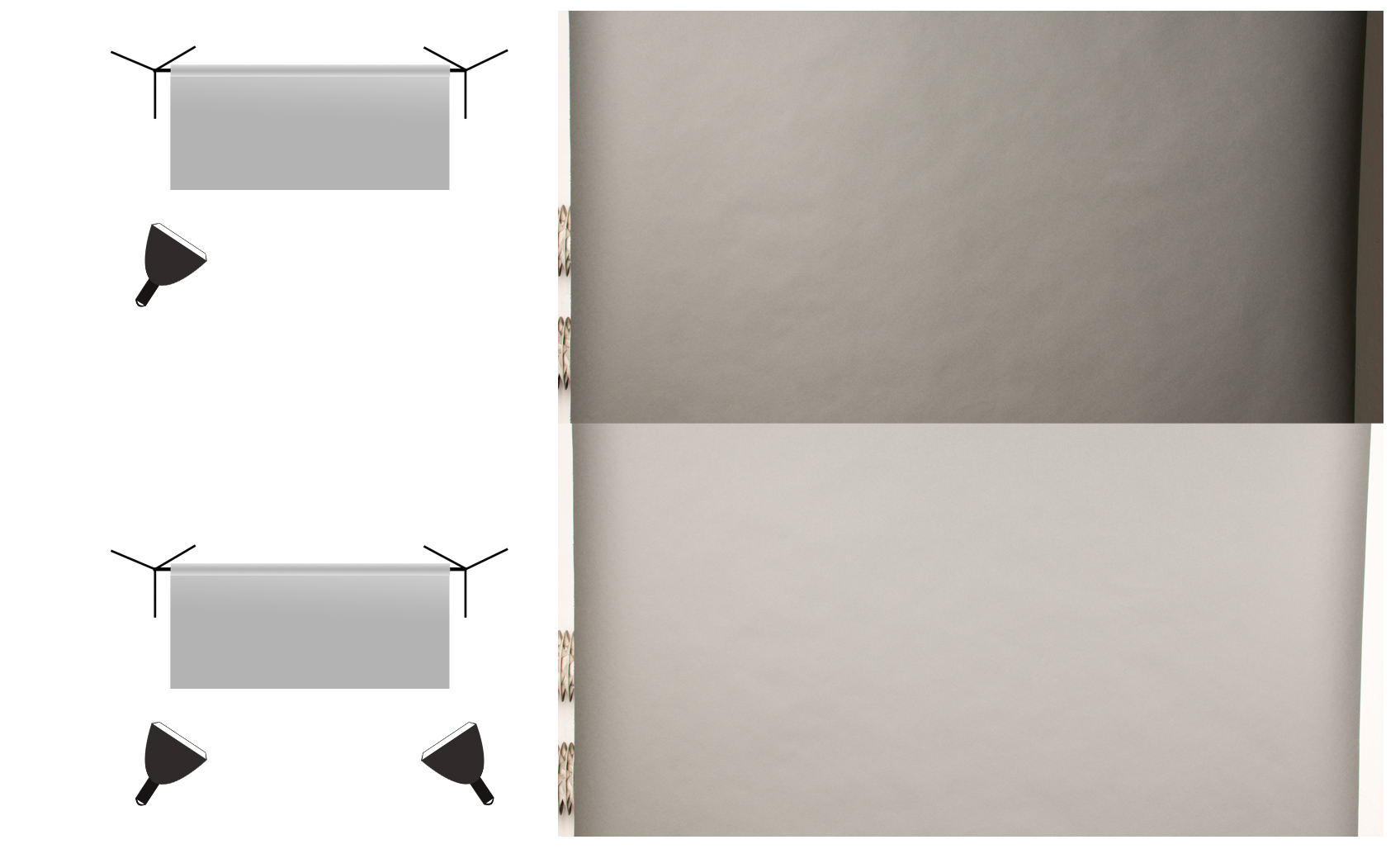 Biorąc pod uwagę szerokość tła ilość potrzebnych lamp do równomiernego go oświetlenia będzie zróżnicowana. Za to niezbędne minimum to dwa punkty świetlne nawet przy najwęższym tle. Na pytanie dlaczego minimum dwa odpowie prawo Lamberta mówiące o spadku natężenia oświetlenia wraz z kwadratem odległości. Zaobserwować je można choćby na tle oświetlanym tylko jedną lampą. Zatem chcąc uzyskać w miarę równomierne oświetlenie stosujemy zawsze minimum dwa punkty świetlne ustawione po przeciwnych jego stronach.
