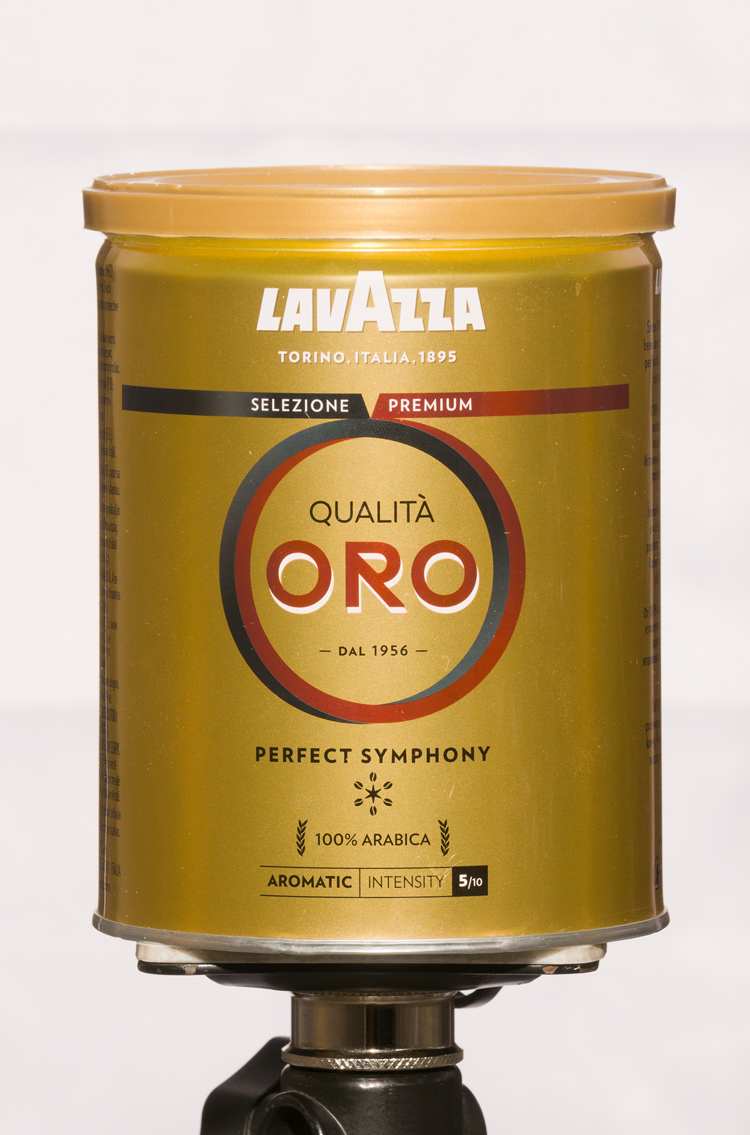 Do tego setupu niezbędne są dwie sporej wielkości powierzchnie dyfuzyjne, które należy ustawić po obu stronach fotografowanego produktu. Lampy ustawiamy po przeciwnej stronie niż temat zdjęcia, w taki sposób aby materiał dyfuzyjny był pomiędzy lampami, a puszką kawy. Tak powstaje poniższe zdjęcie.