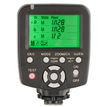 Sterownik pozwala na zdalną zmianę trybu pracy. Do wyboru mamy tryb manualny, stroboskopowy lub całkowite wyłączenie danej grupy. Zdalnie również sterujemy mocą czy zoomem lamp. Zdalne zarządzanie usprawnia pracę i oszczędza czas. Wyzwalacz pracuje na częstotliwości 2,4Ghz dlatego jego zasięg maksymalny to aż 100m. Daje to możliwość stworzenia rozległego planu zdjęciowego.