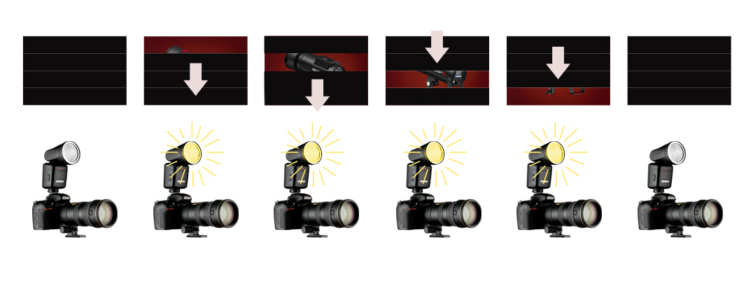 Funkcja ta powoduje wydłużenie czasu trwania błysku, poprzez wielokrotne jego wyzwolenie, podczas całego czasu otwarcia migawki. Lecz niestety aby lampa mogła wykonać serię błysków podczas szczelinowego odsłaniania matrycy musi ona znacząco zmniejszyć moc, gdyż w tak krótkim czasie nie zdążyłyby się naładować ponownie kondensatory w lampie.