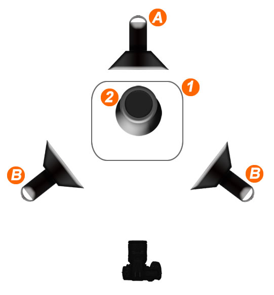 Lampy reporterskie, które mają doświetlać przód obiektu fotografowanego, ustawiłem w taki sposób aby światło z lamp wpadało przez boczne ścianki namiotu pod kątem około 45°. Lampy ustawiłem w dwie grupy. Pierwsza (grupa „A”) to lampa doświetlająca namiot bezcieniowy od tyłu, druga (grupa „B”) to lampy doświetlające przód obiektu.